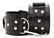 Наручники черного цвета выполнены из кожи. Они украшены заклепками и соединены цепью с карабинами. Размер наручников может быть регулирован благодаря застежке-липучке. Ширина наручников составляет 5 см, а длина цепочки равна 15,5 см.
