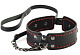 Ошейник изготовлен из натуральной кожи. По периметру декорирован контрастной строчкой. Регулируется при помощи металлической пряжки. В комплекте идет кожаный поводок. Ширина ошейника - 4,5 см.