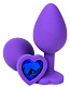 Фиолетовая силиконовая анальная пробка с синим стразом-сердцем - 8 см.