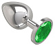 Серебристая большая анальная пробка с зеленым кристаллом - 9,5 см.
