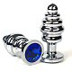 Серебристая ребристая анальная пробка с синим кристаллом - 6 см.