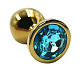 Золотая анальная пробка из алюминия размер S. Страз в основании круглой формы, выполнен из стекла голубого цвета. Упакована в вельветовый мешочек для хранения. Вес - 52 гр.