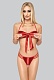 Двухчастный комплект, выполненный из красной, слегка блестящей ткани. Стринги изготовлены из ткани, соединенной тремя эластичными полосками, чудесно облегающими женские бедра и соблазнительно экспонируют животик. Лифчик, застегивающийся сзади, представляет собой соединение полосок из эластичной ткани и завязанного спереди банта. Все вместе выглядит фривольно и кокетливо, одним словом, – это идеальный комплект для сумасшедших любовных утех. В комплекте: лиф, трусики-стринги.