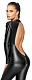 Высокоэластичный комбинезон с длинными рукавами, облегающий покрой, в сексуальном wet-look. Элегантный воротник-стойка застегивается на пуговицы на шее. Застежка-молния в промежности.