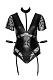 Боди с короткими рукавами впечатляет глубоким вырезом и множеством съемных и регулируемых элементов, таких как подтяжки, воротник и манжеты по бокам. Эти ограничения делают тело больше, чем просто предметом одежды, и позволяют играть в мягкую игру связывания. Двухсторонняя молния в промежности также позволяет заниматься сексом, не снимая эту красивую одежду заранее.