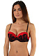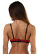 Женский бюстгальтер красно-черного цвета, декорирован шнуровкой на чашках. Бретели регулируются, есть push up.