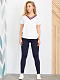 Женские легинсы из плотного хлопкового трикотажного полотна синего цвета. Особое украшение модели – спортивная резинка в сине-красно-белую полоску, которая мягко и уверенно фиксирует легинсы на бедрах. Средняя посадка.