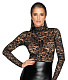 Платье до колен с длинными рукавами, в обтяжку, строгий крой в черном элегантном сочетании мягкого кружева (верх) и матового блестящего материала wet-look (часть юбки). Небольшой воротник-стойка, застегивающийся на 2 пуговицы сзади. Небольшой разрез на подоле сзади.
