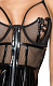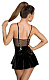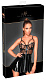 Полупрозрачное платье-бюстье с косточками, регулируемыми лаковыми бретелями, с короткой расклешенной юбкой из блестящего лака. Благородная вышивка на чашечках, декоративные полоски из лака и сплошная молния спереди делают сексуальный образ идеальным.