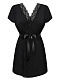 Короткий пеньюар из эластичной облегающей ткани. Украшен узорчатым кружевом по краю и на боках. Пеньюар завязывается на талии при помощи глянцевого атласного пояса. Кокетливый сатиновый бантик на спинке добавляет модели изюминку.