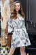 Короткий запашной халат выполнен из искусственного принтованного шелка. Низ рукавов халата декорирован кружевом, в боковых швах карманы.