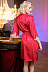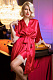 Короткий халат с широкими рукавами длиной ¾ выполнен из искусственного шелка рубинового цвета. Рукава халата декорированы по низу кружевом. Халат завязывается широким эффектным поясом, в боковых швах карманы.