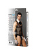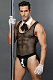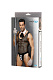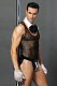 Майка с глубоким вырезом из крупной сетки подчеркивает рельеф грудной клетки. Воротник на кнопке, декорированный галстуком-бантом, расстегивается одним движением руки. Трусы-джоксы (с открытыми ягодицами) и откидывающимися фалдами на широких эластичных резинках делают образ незабываемым. Контрастный декор и пуговицы грамотно расставляют акценты. В комплекте: топ, воротник с галстуком, трусы и перчатки.