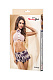 Костюм школьницы. Топ из эластичной сетки декорирован спереди непрозрачной вставкой и пуговицами, на застежке крюк-петля сзади. Воротник-стойка на липучке , украшен контрастным бантом. Юбка, Т-стринги и бант выполнены из клетчатого трикотажа. В комплекте: топ, юбка и стринги.
