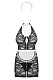 Костюм горничной для ролевых игр из четырех предметов. Короткое платье изготовлено из кружева с цветочных мотивом. Спереди украшено пикантными вырезами и декоративными пуговицами. Платье завязывается бантом на шее с помощью белых атласных лент, обнажая спину. Фартук, декорированный оборками и бантиком также завязывается на ленты. Ободок на голову с нежной оборкой дополняет образ. В комплекте: платье, фартук, ободок, трусики-стринги.