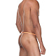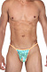 Бирюзовые трусы-стринги с растительным принтом и контрастной отделкой.