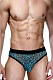 Мужские тонги из полупрозрачной ткани с расцветкой голубой леопард, с черным кантом и на широком черном поясе.