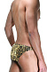 Мужские золотистые трусы-слипы с черными буквами.