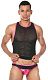 Интересный мужской комплект из майки и трусов-слипов. Майка-борцовка из полупрозрачного материала с контрастной окантовкой. Трусы-слипы из комбинации двух материалов: гладкого блестящего и полупрозрачного цвета. В комплекте: майка, трусы.