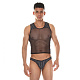 Мужской комплект, состоящий из трусов-тонг, черных в тонкую белую полоску, и короткой майки на широких лямках. Сама майка из полупрозрачной тонкой очень мелкой сетки, на плечах вставки из материала в белую полоску, такого же, как на тонгах. В комплекте: майка, трусы.