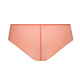 Трусики-слип Greta, спереди со вставками из кружевного полотна и эластичной телесной сетки, спинка из сетки цвета коралл, сложенной вдвое. Ластовица проложена 100% хлопком.